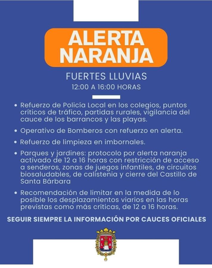 Debido a la Alerta Naranja por fuertes lluvias decretada para hoy en Alicante, quedan suspendidos todos los entrenamientos al aire libre programados para esta tarde (aquellas actividades que se realizan en interior - gimnasia rítmica, entrenamientos de pabellón, ...- , continúan).