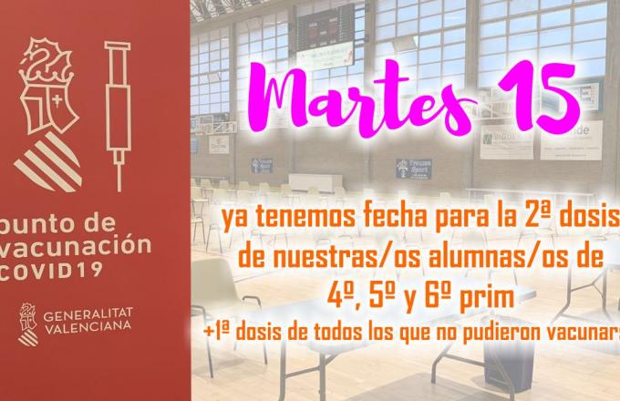 Ya tenemos fecha para recibir la 2ª dosis (pediátrica) de la vacuna a nuestras/os alumnas/os de 4º, 5º y 6º de primaria y a todos/as los que no pudieron vacunarse con la 1ª dosis en anteriores ocasiones. El martes 15 volveremos a convertir nuestro pabellón...
