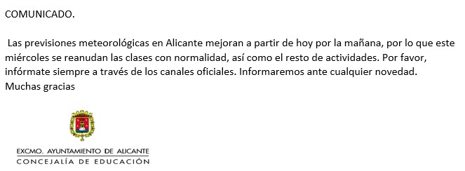 El Ayuntamiento de Alicante ha emitido el siguiente COMUNICADO dadas las previsiones meteorológicas. SE REANUDAN LAS CLASES CON NORMALIDAD. Dado el estado de las pistas deportivas, NO REALIZAREMOS ENTRENAMIENTOS al aire libre. En el caso de no poder recoger a vuestros/as hijos/as serán atendidos por los monitores/entrenadoras. Os deseamos paciencia y precaución en la carretera.